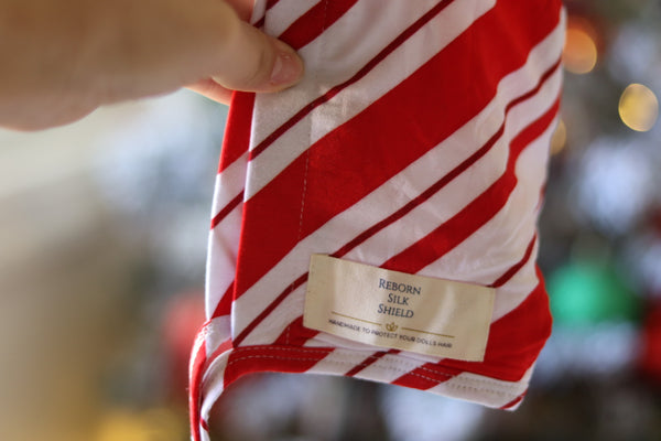 Step into the magic of the holidays with our limited-edition Candy Cane Lane Silk Shield Set! This festive bundle includes two Newborn-size Reborn Silk Shields, designed to protect your doll’s hair with ultra-soft, eco-friendly bamboo silk — and wrapped in cozy holiday charm.